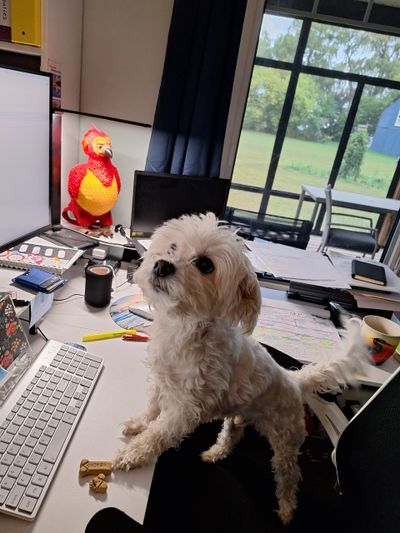 My name is Molson. I'm a 14 year-old Maltese/Bichon mix dog called a Maltichon. As you can see, I'm working very hard with my best friend Jenny who usually does the typing....but I give her all the ideas. I make sure I like what she does!